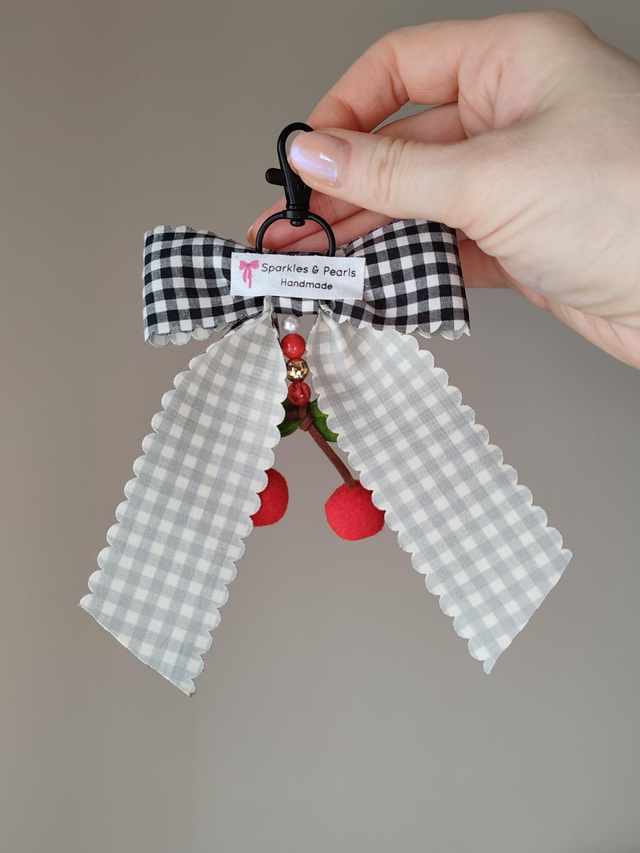 Gingham print ribbon bow with cherry charm 🍒
